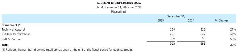 门店方面,2025年第四季,萨洛蒙品牌新增39家门店,主要集中在大中华区。2025年全年,品牌所在户外性能板块DTC门店增至331家,超过技术服装板块的288家。